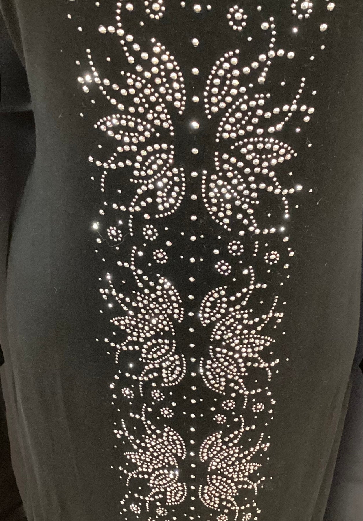 Black dress is long sleeves with rhinestones going down the front and the sleeves very stretchy. One size fits some size small two extra large.