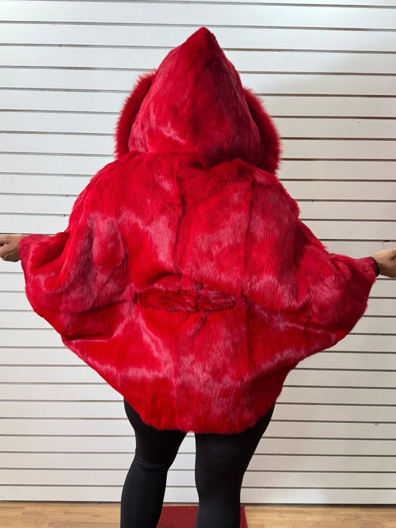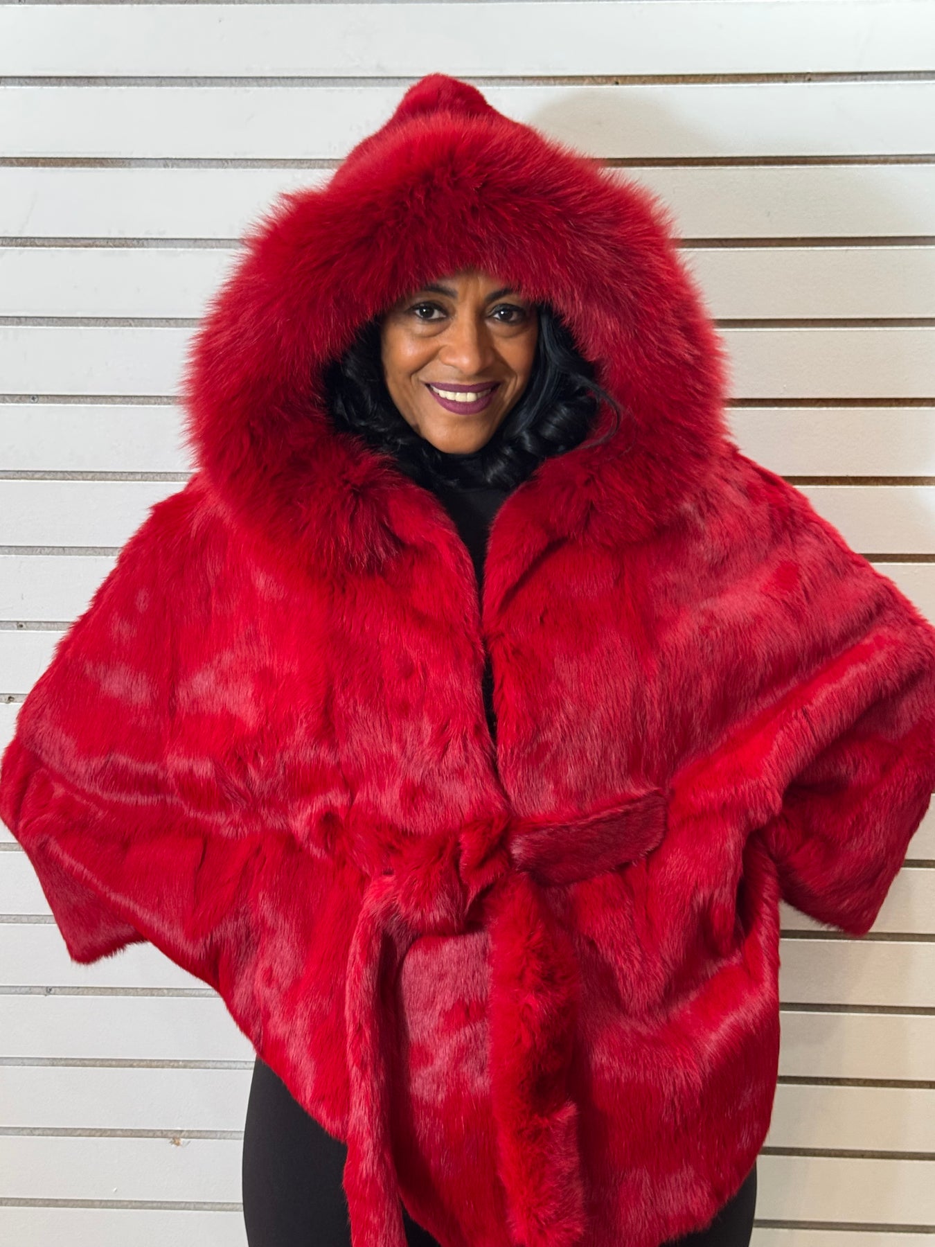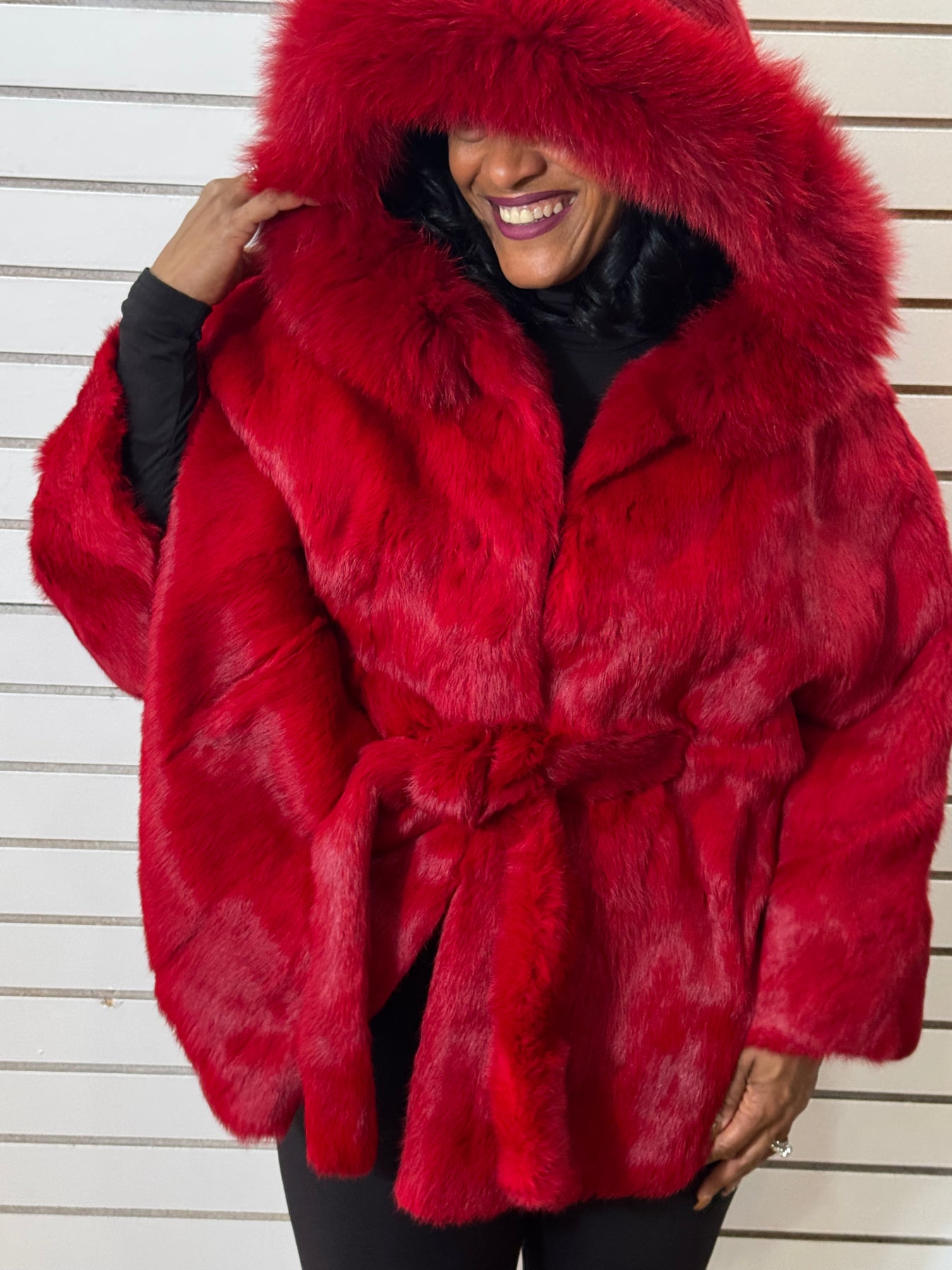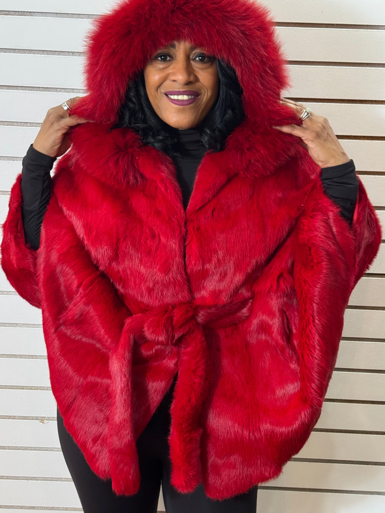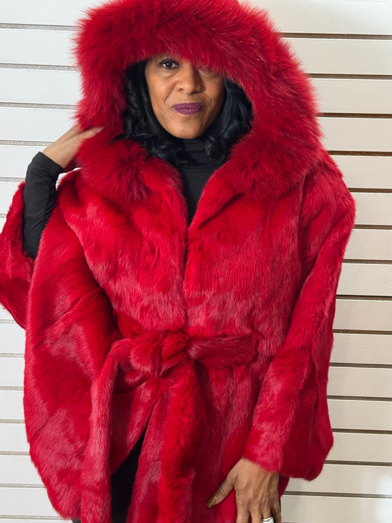 Red rabbit and fox cape, belted waistline pockets. One size fits small through 1xlg