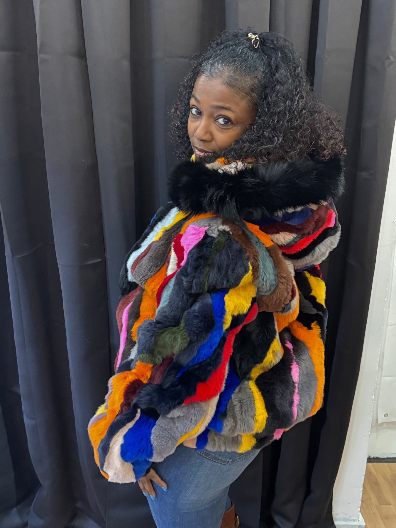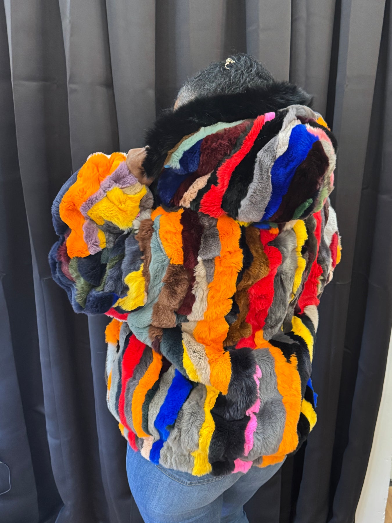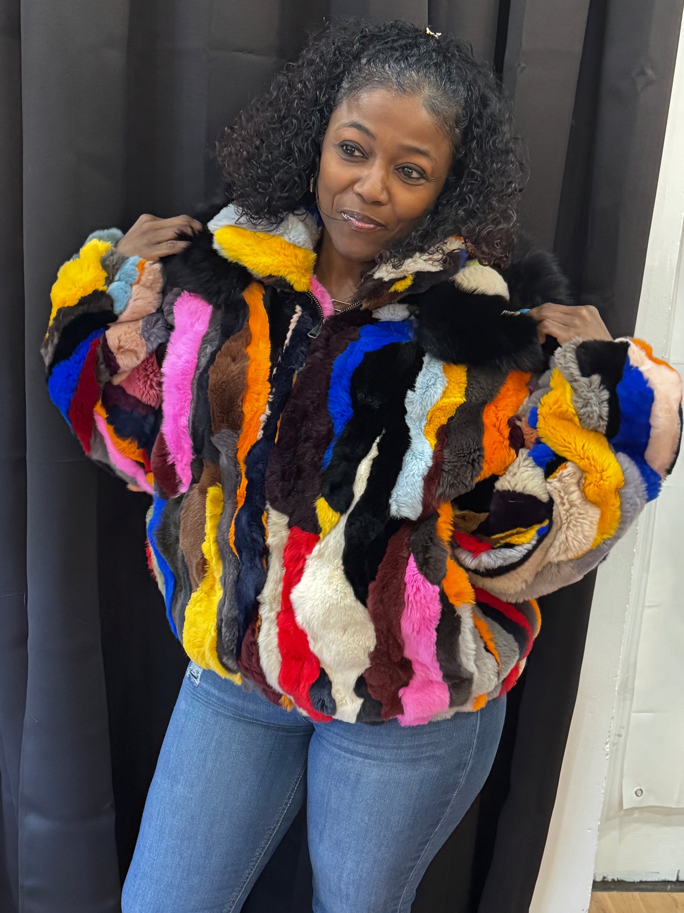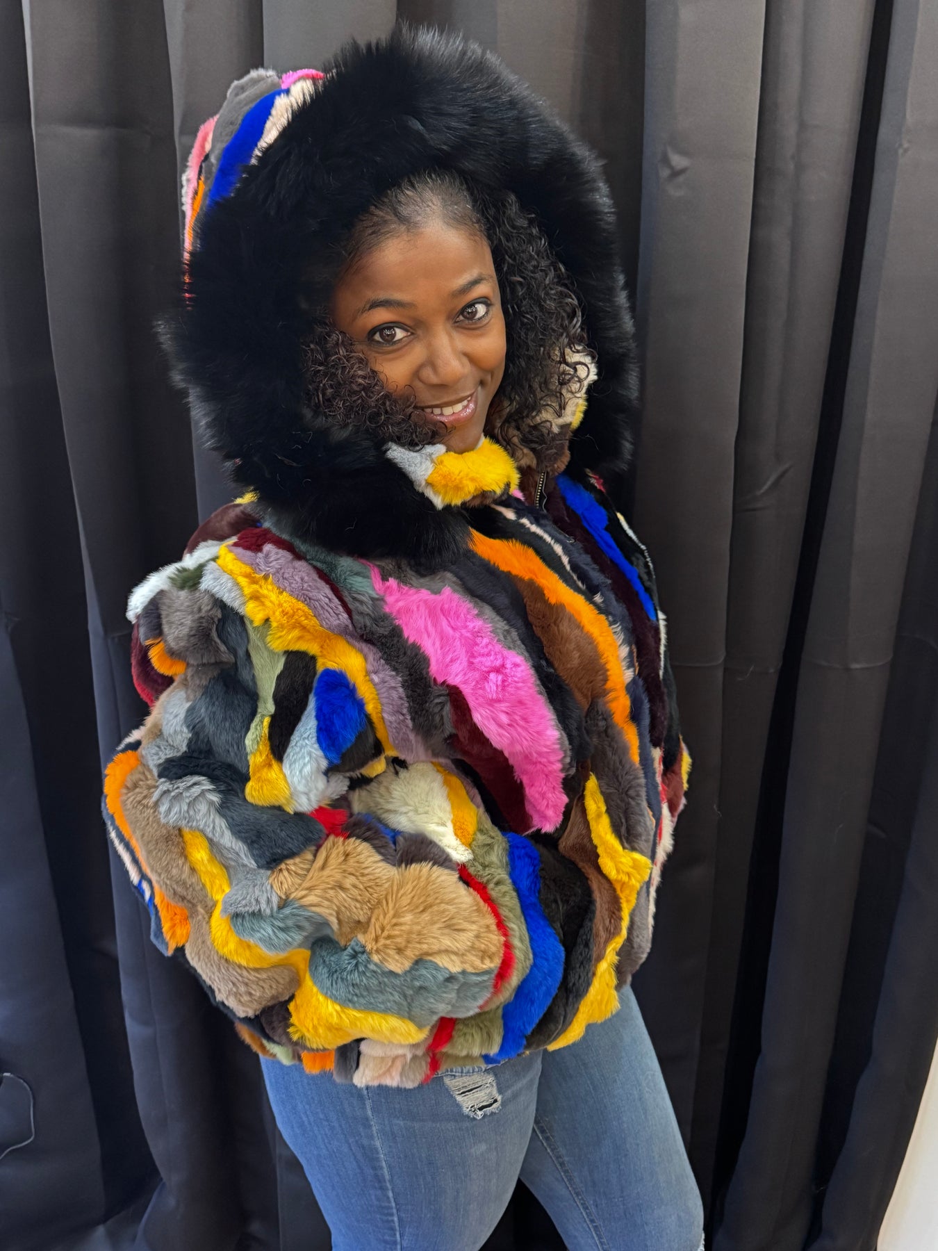 Muti color hooded rabbit and fox bomber jacket elastic in bottom of jacket.  This is a statement piece.