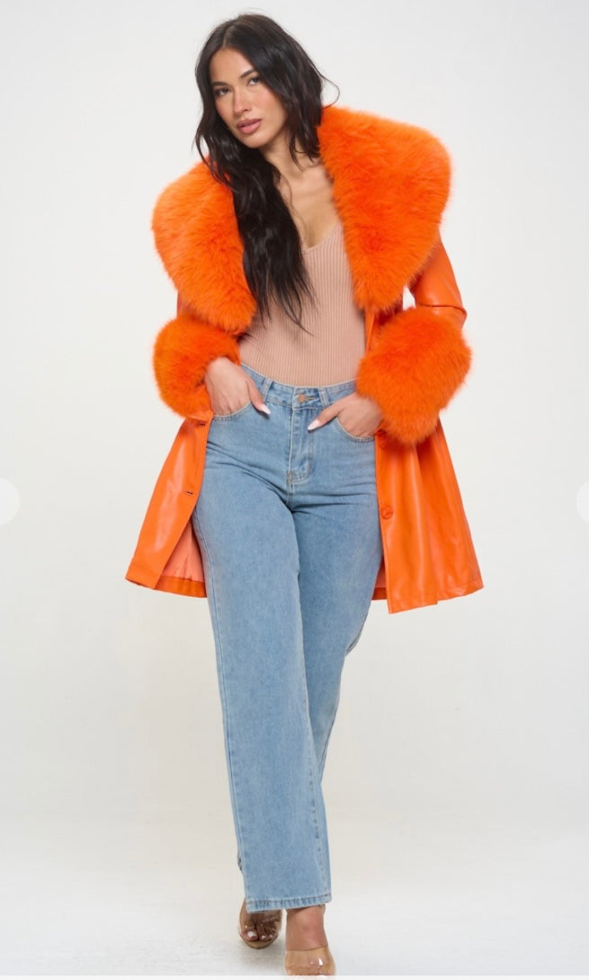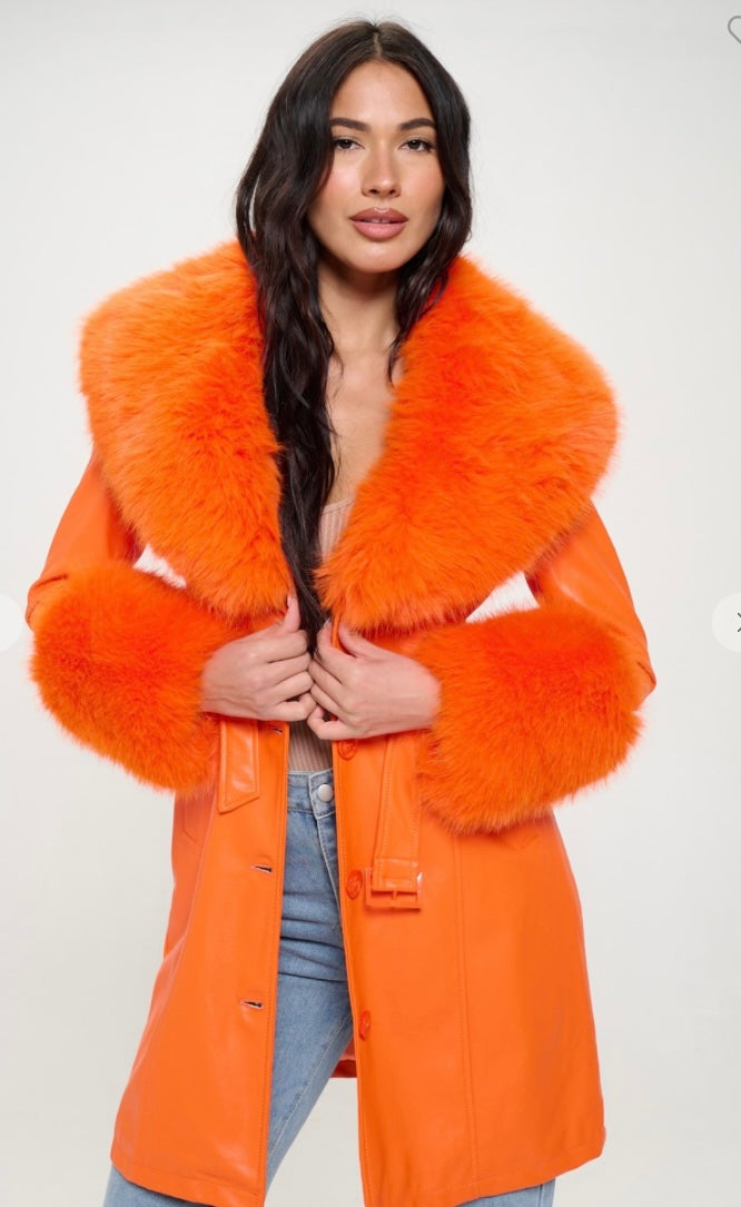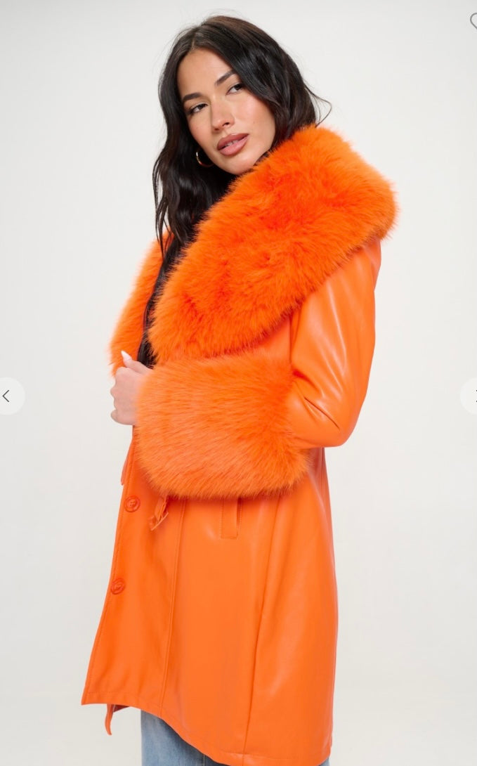 Orange faux fur and vegan leather coat removable fur