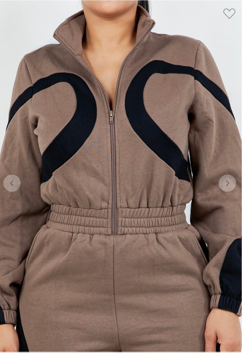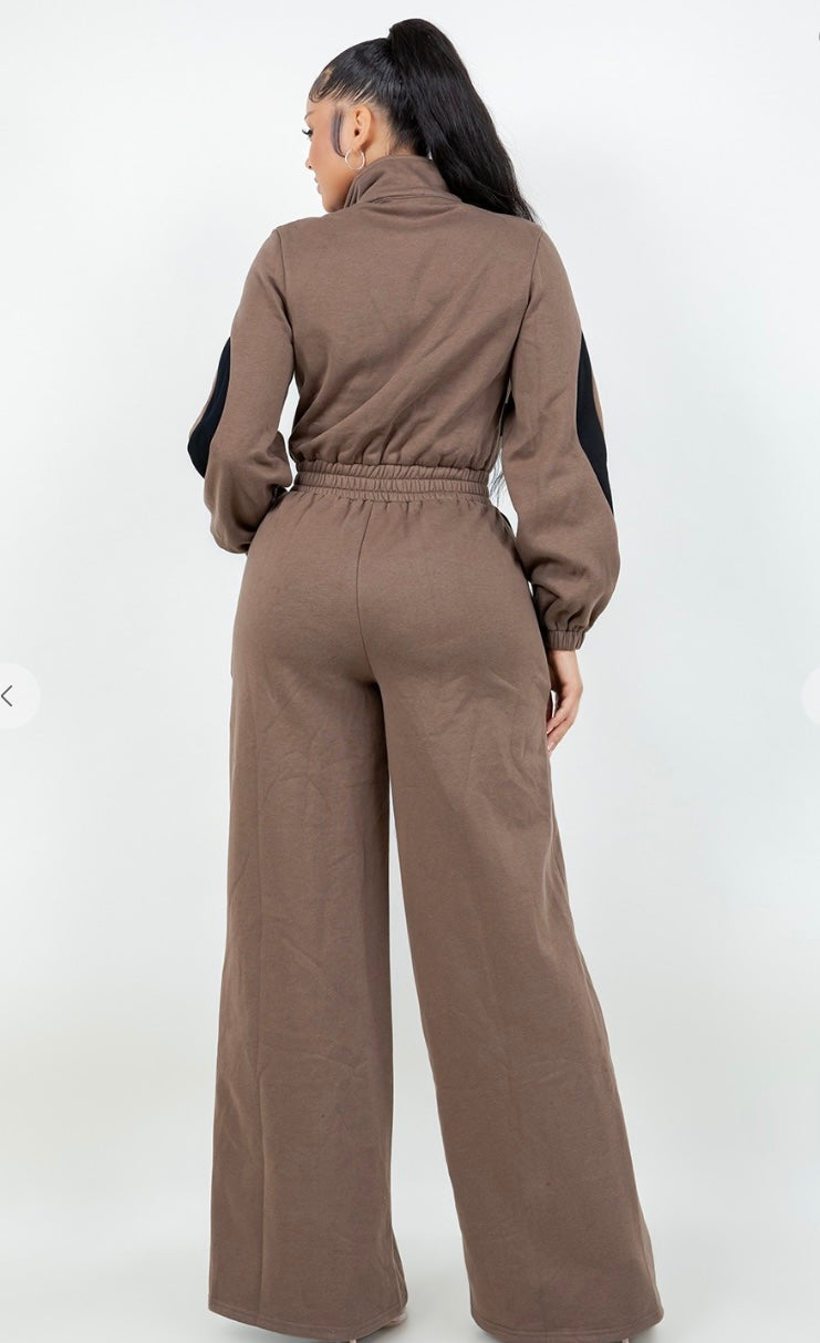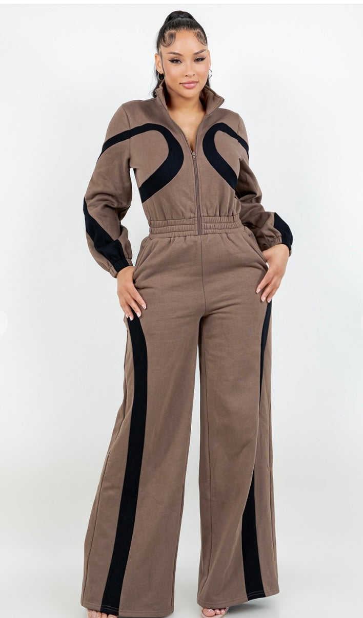 You will love this taupe and black jumpsuit. It is fleece in the inside has elastic waist wide leg with pockets very comfortable.