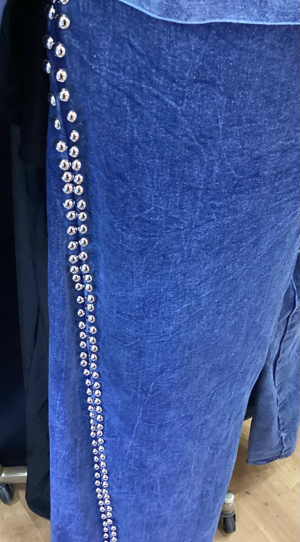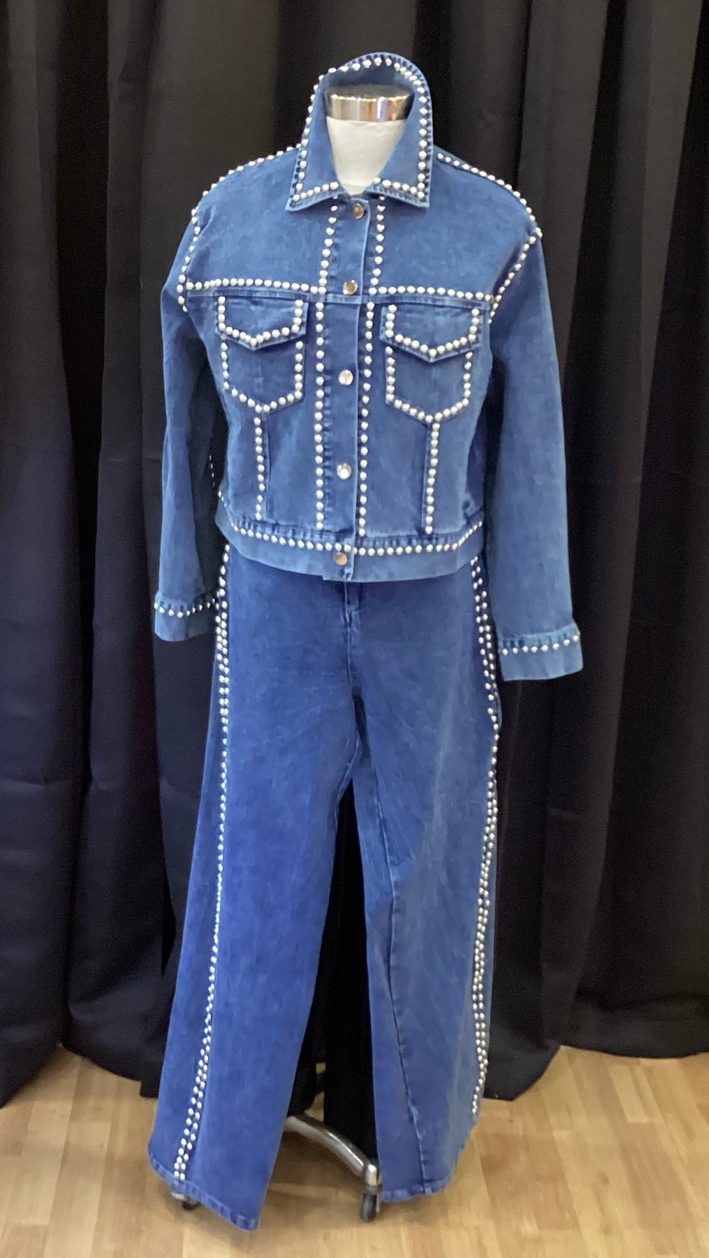 Blue, jean jacket, trimmed, and silver studs with matching jeans, trimmed and silver studs very stretchy