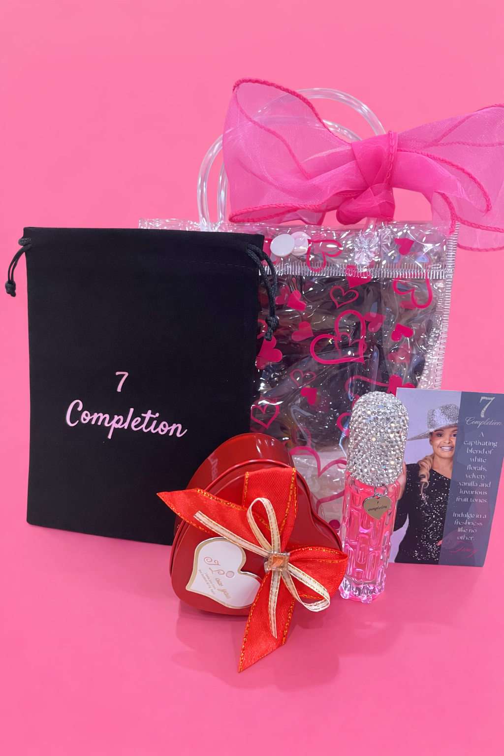 This set is good for Valentine’s Day Galentine’s Day Mother’s Day when you are looking for the perfect gift you can get 7 completion perfume gift set comes with seven completion, perfume velvet bag, beautiful gift bag with bow and Heart tin red roses inside and you can also use as a Jewlery box