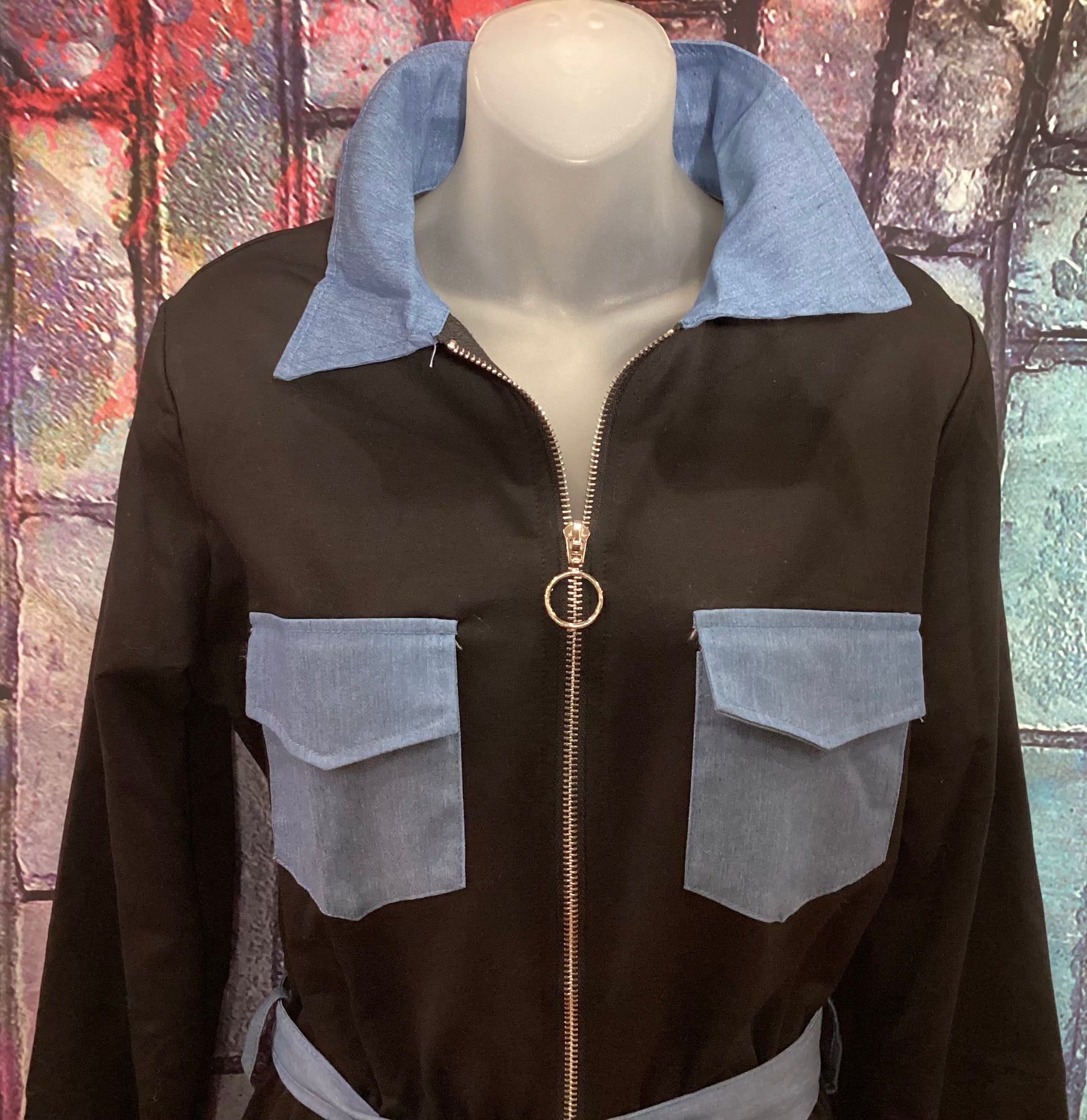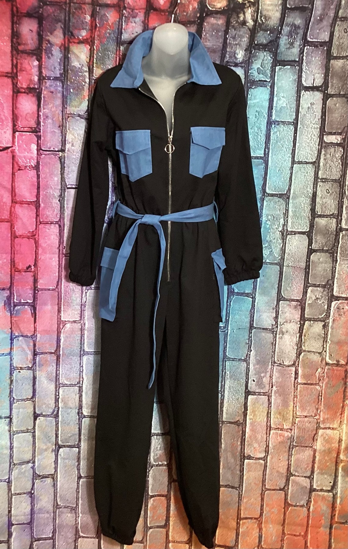 Black jumpsuit with blue jeans, pockets and collar, comes with Jean belt very stretchy
