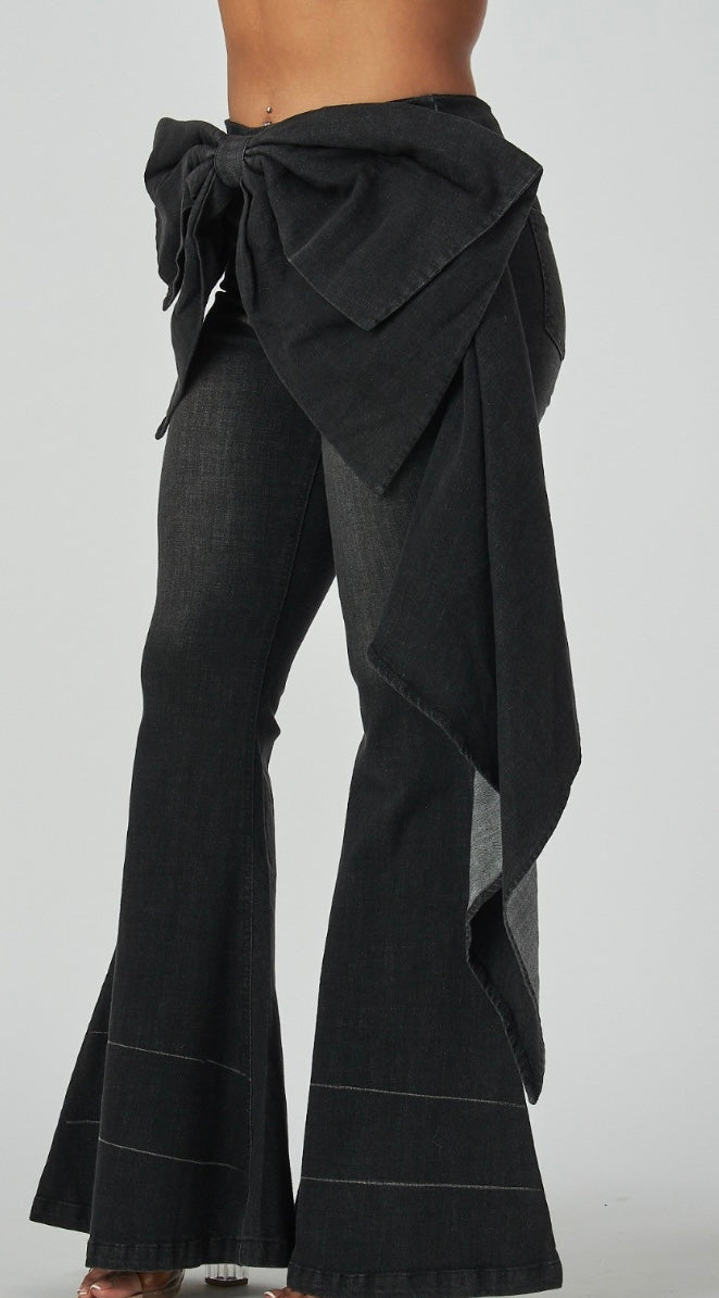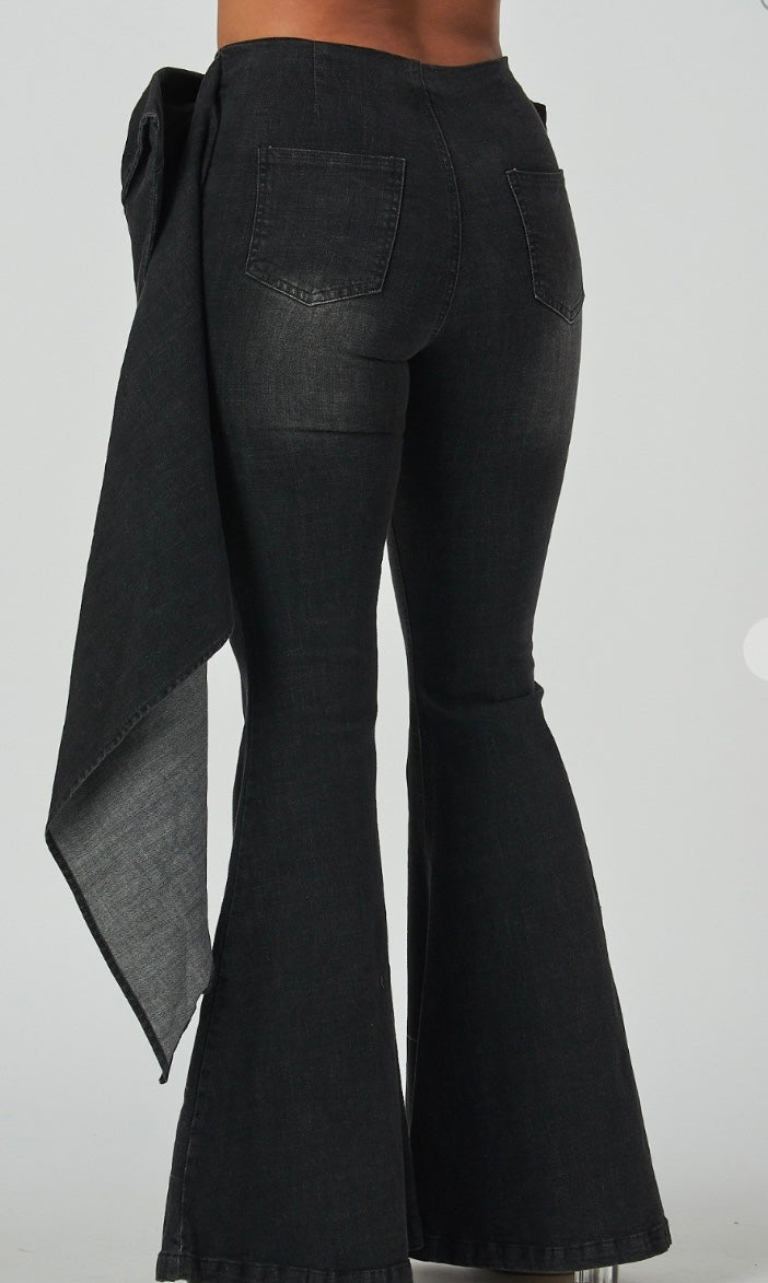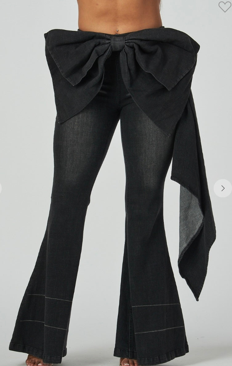 Black Denim Flare Pants w/ Oversized Bow Detail