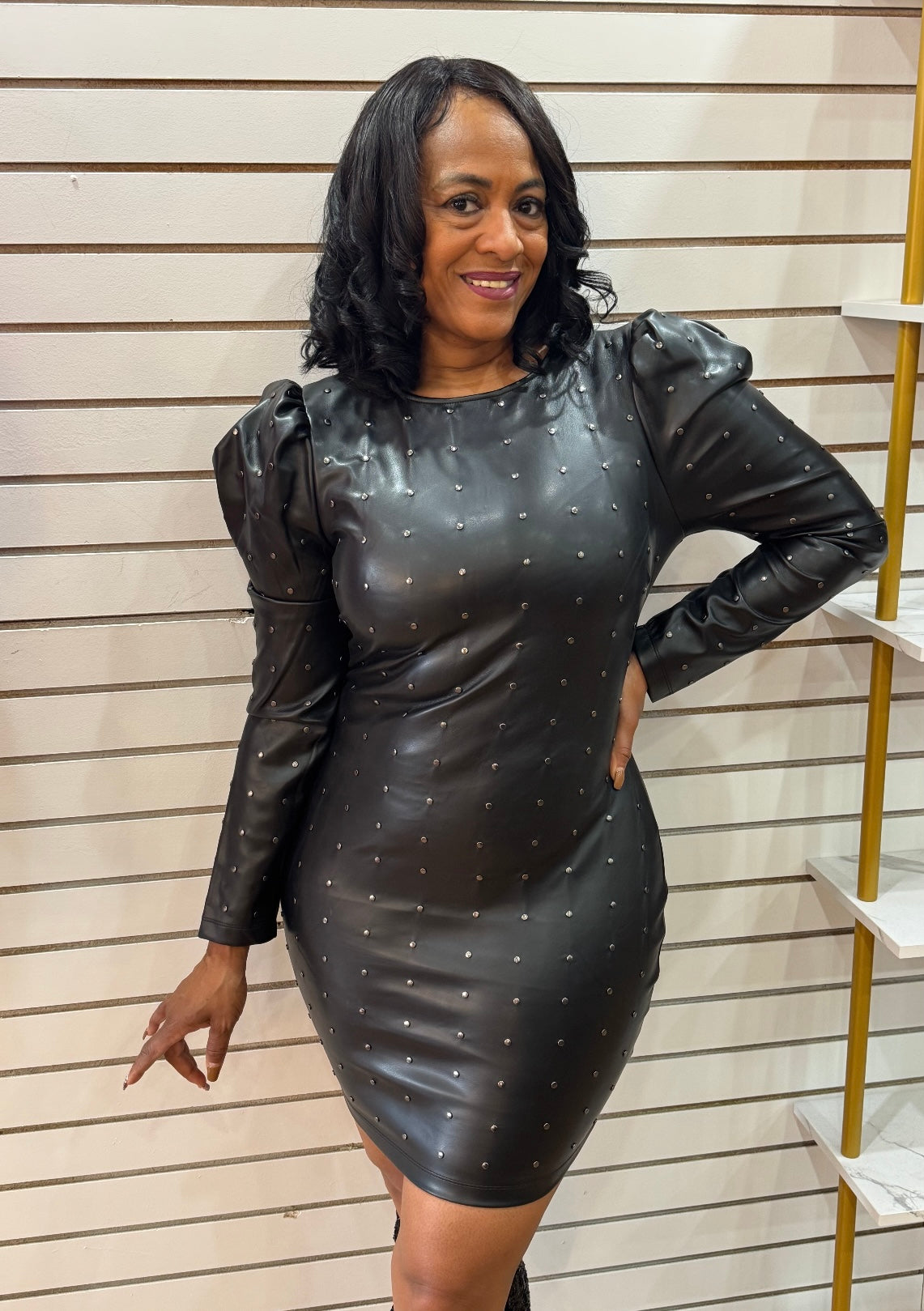 Black faux leather dress has puff sleeve with studs, sprinkled all over it. The Model has on a medium.