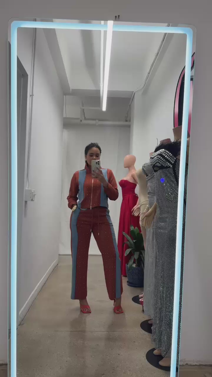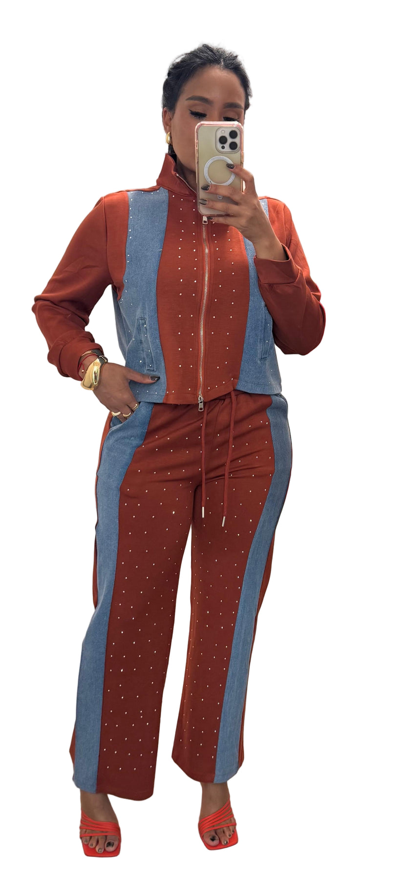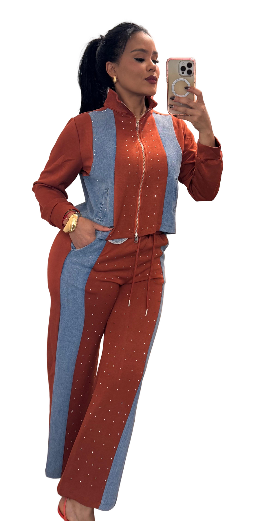 Blue denim and rust 2pc pants set zipper front elastic in waist of pants embellished with studs this is a sharp set