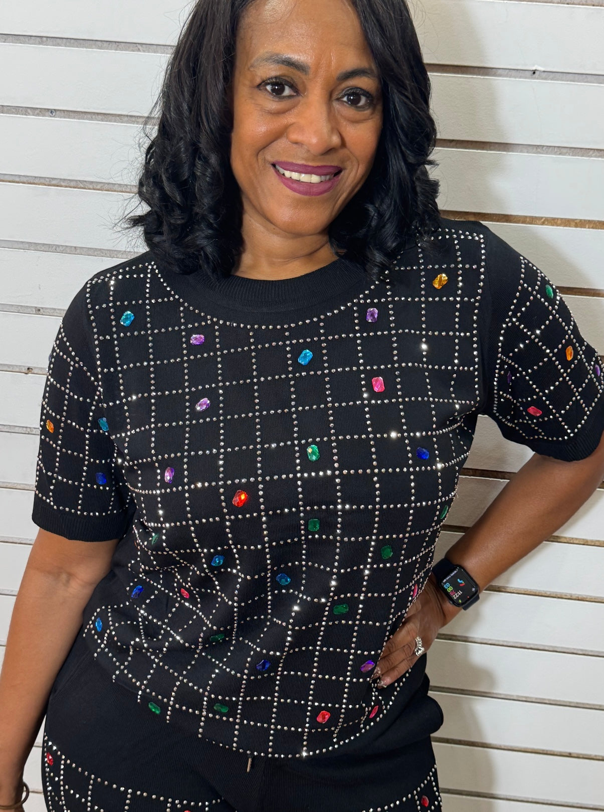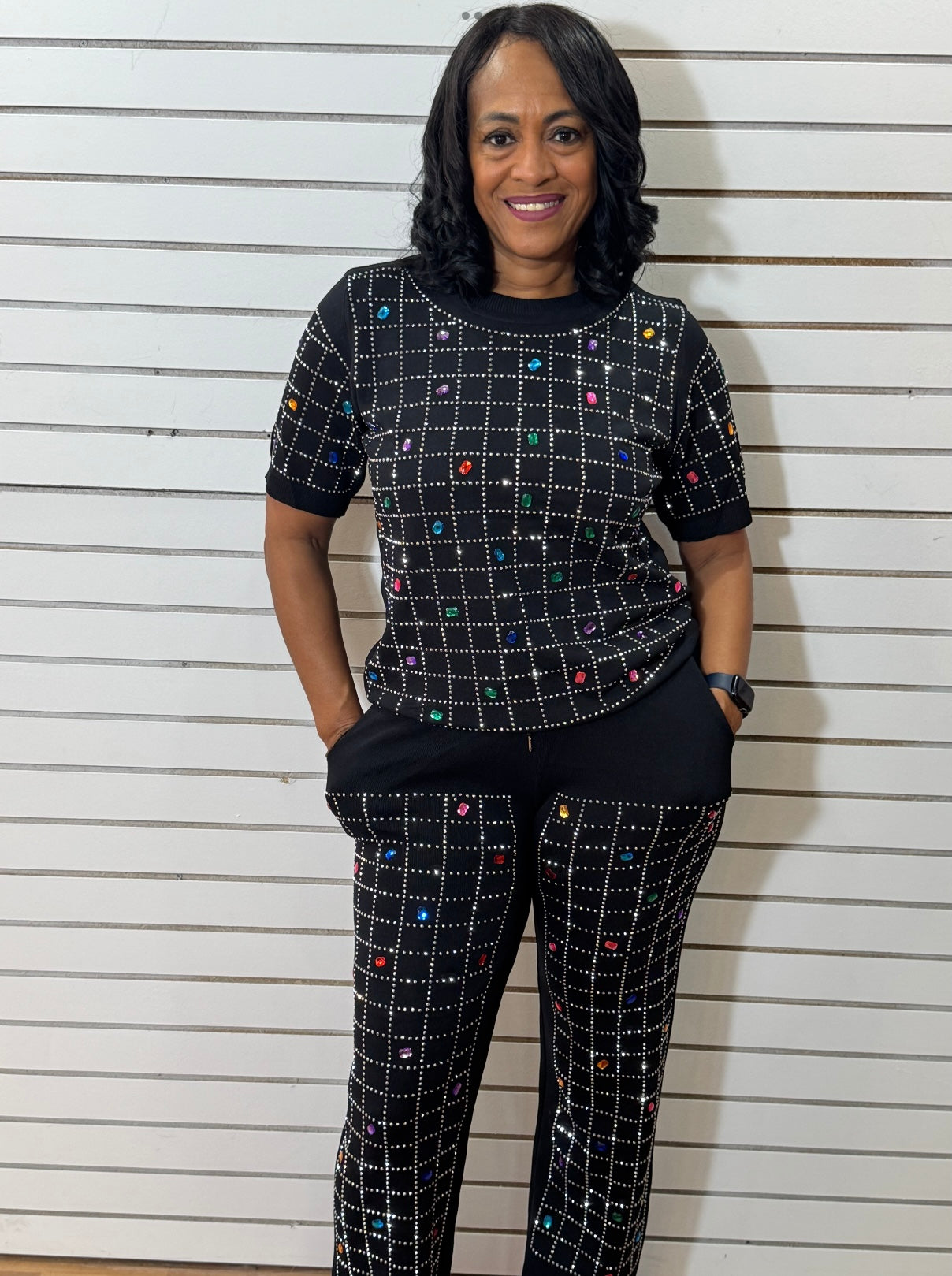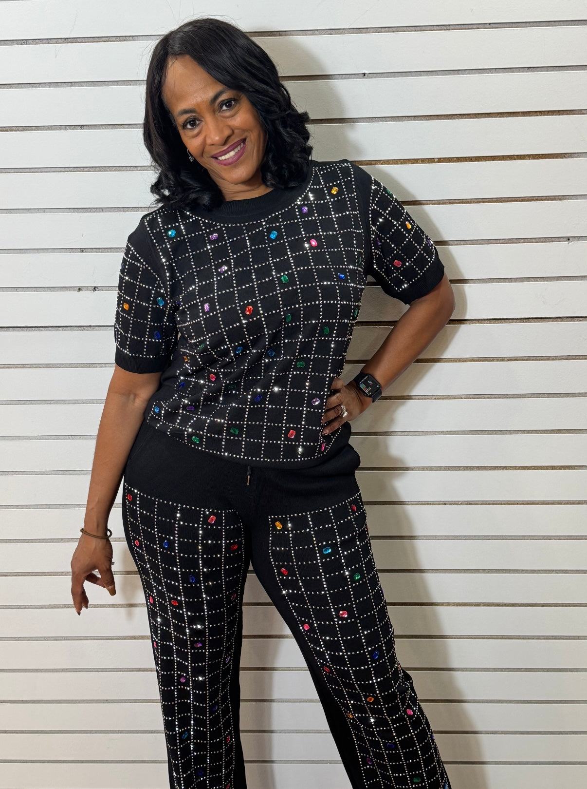 Black sweater set has multicolored stones splattered all over it very spectacular has pockets. Good stretch.
