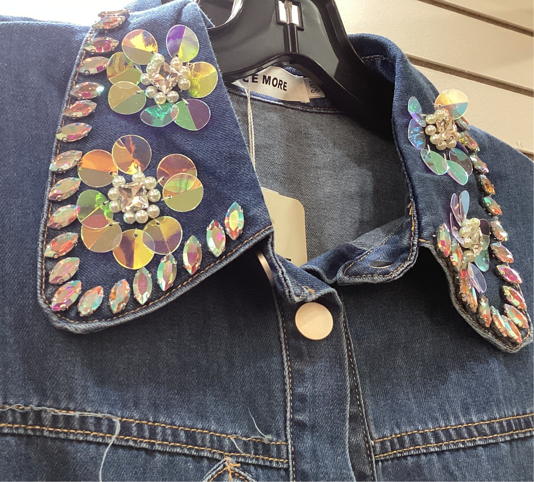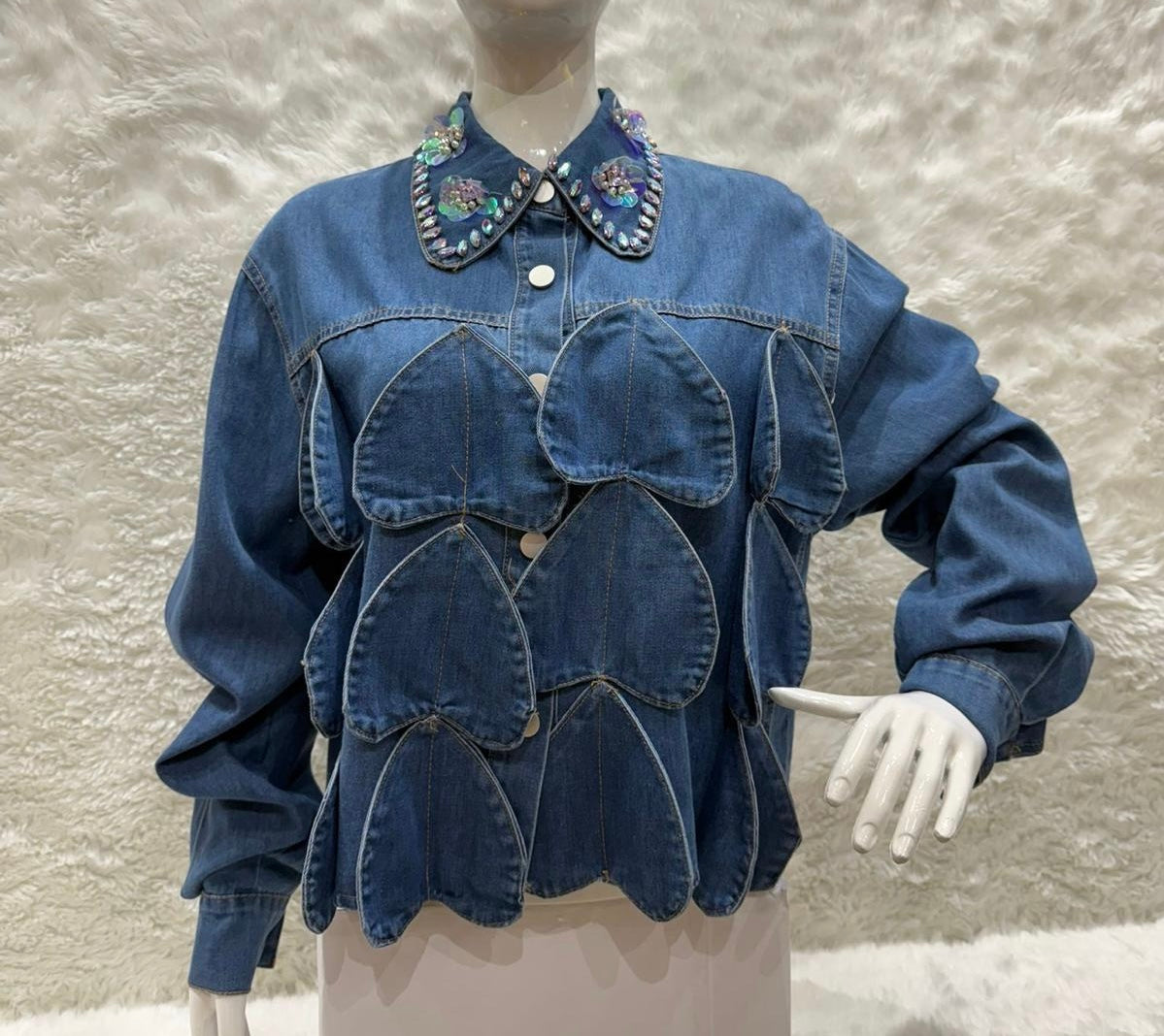 You will love this blue Jean 3-D top. The collar has the ultimate bling.